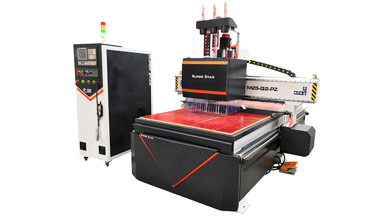 數(shù)控開料機通過氣缸的切換實現(xiàn)系統(tǒng)自動換刀,并且打孔的時候如果孔徑較大可以通過擴孔實現(xiàn)大孔徑的三合一孔、膠粒孔以及木銷孔的加工,滿足生產工藝需求。另外還可以實現(xiàn)自動劃槽、自動開料、自動推料等功能,自動化程度較高。
